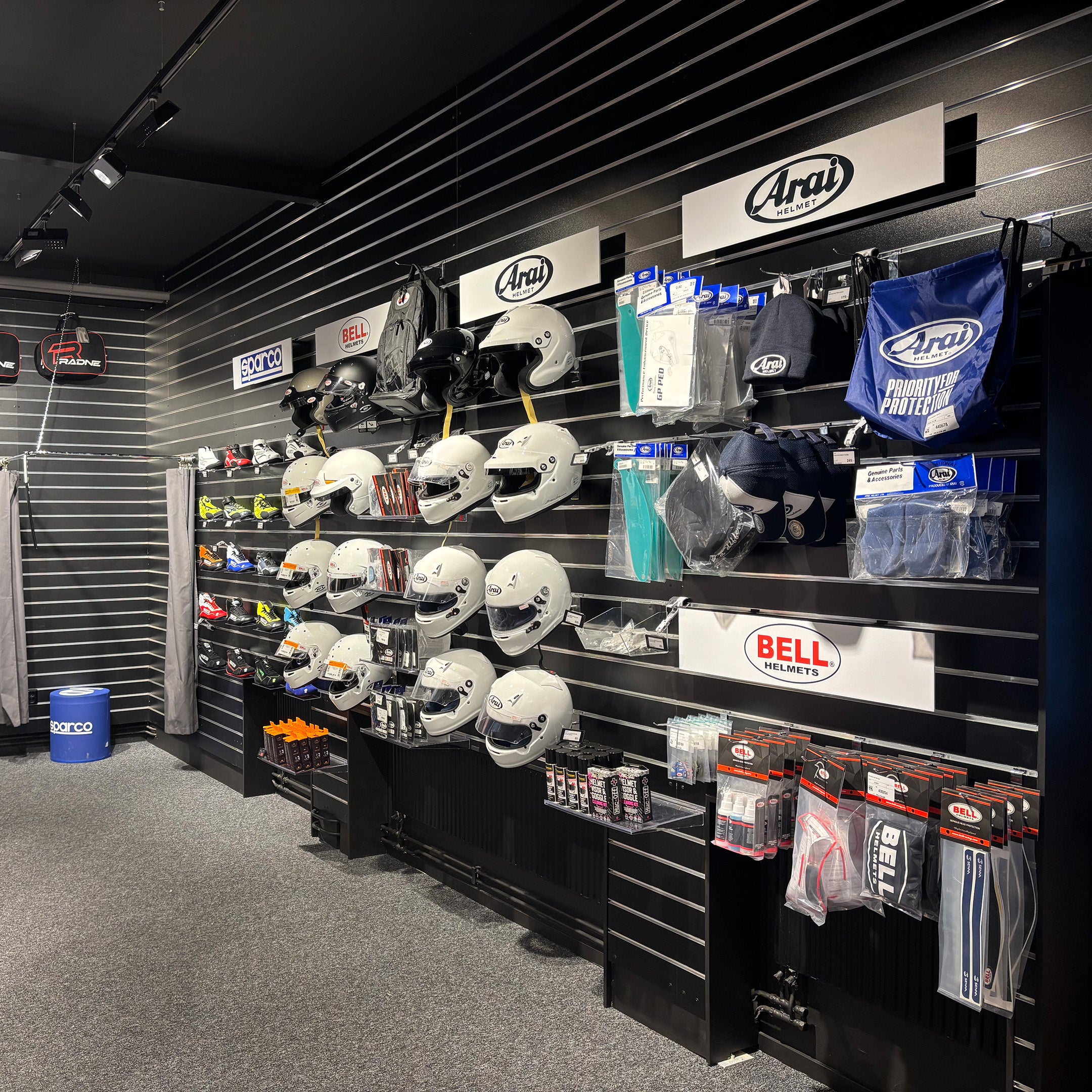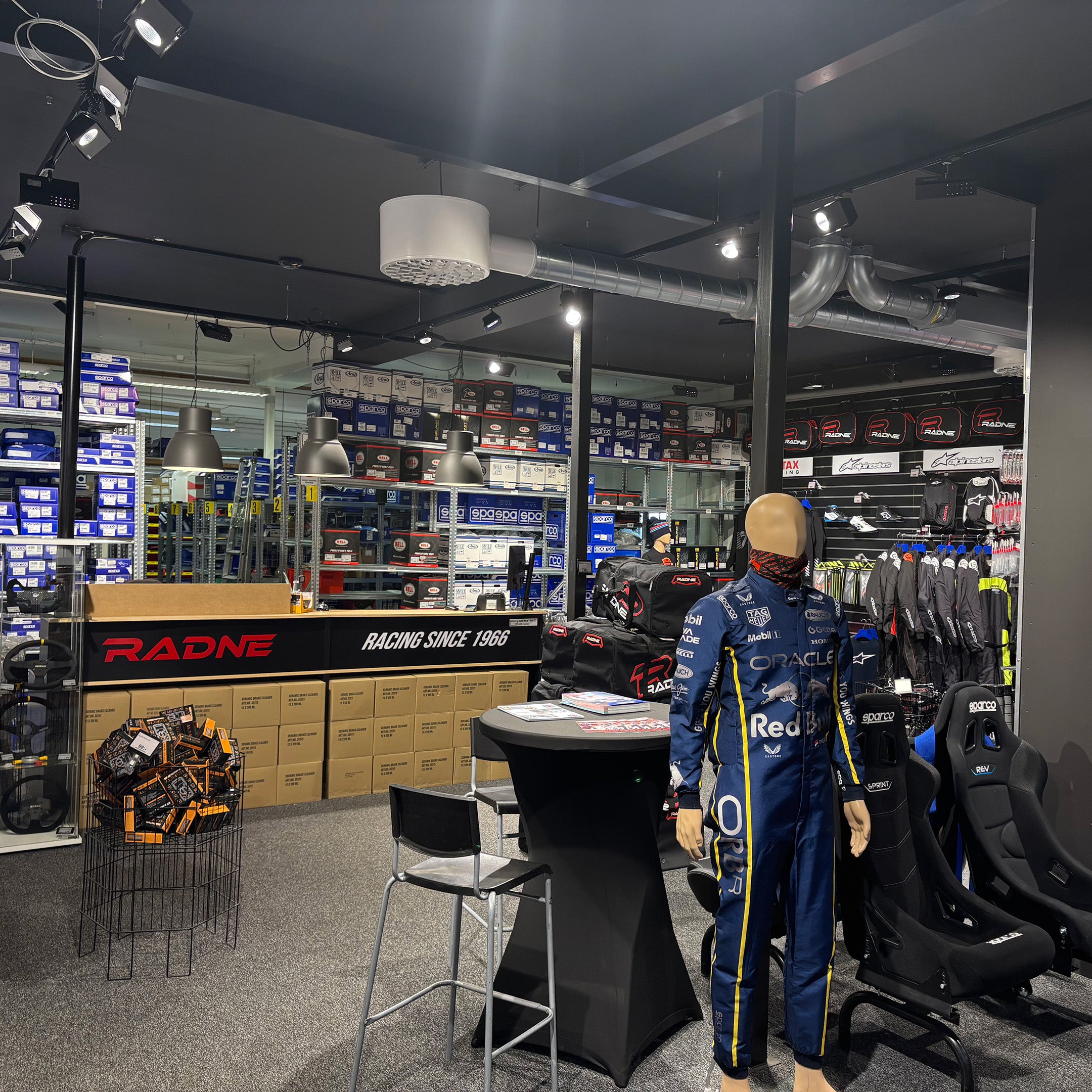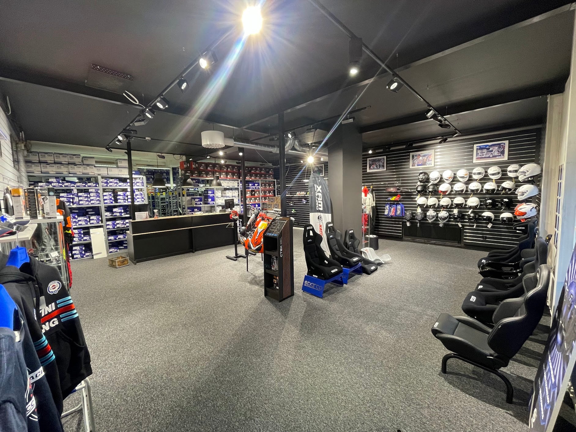 Vi har et velassorteret lager med racerdragter, hjelme og udstyr. Du kan også se vores komplette gokarts, som er klar til øjeblikkelig levering.