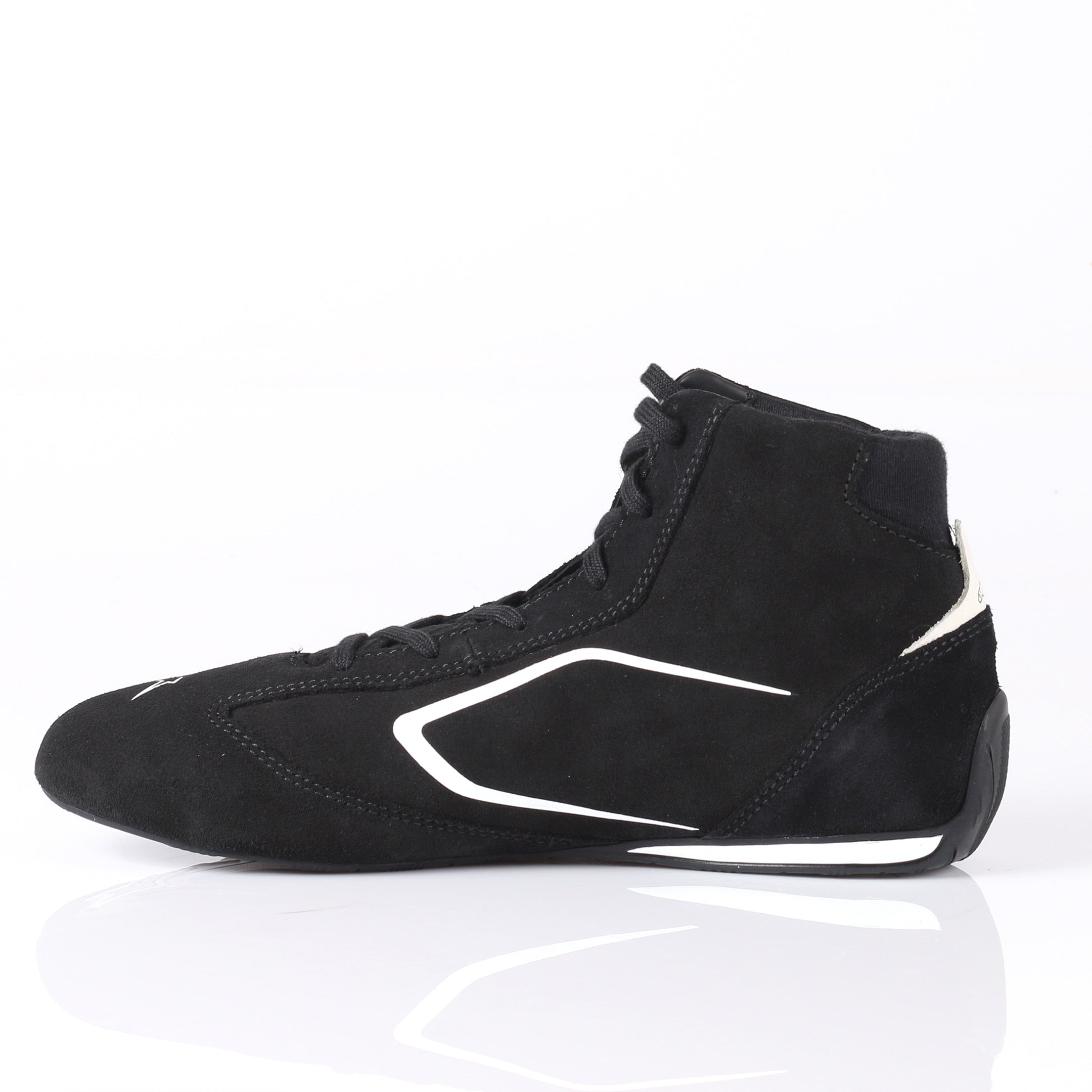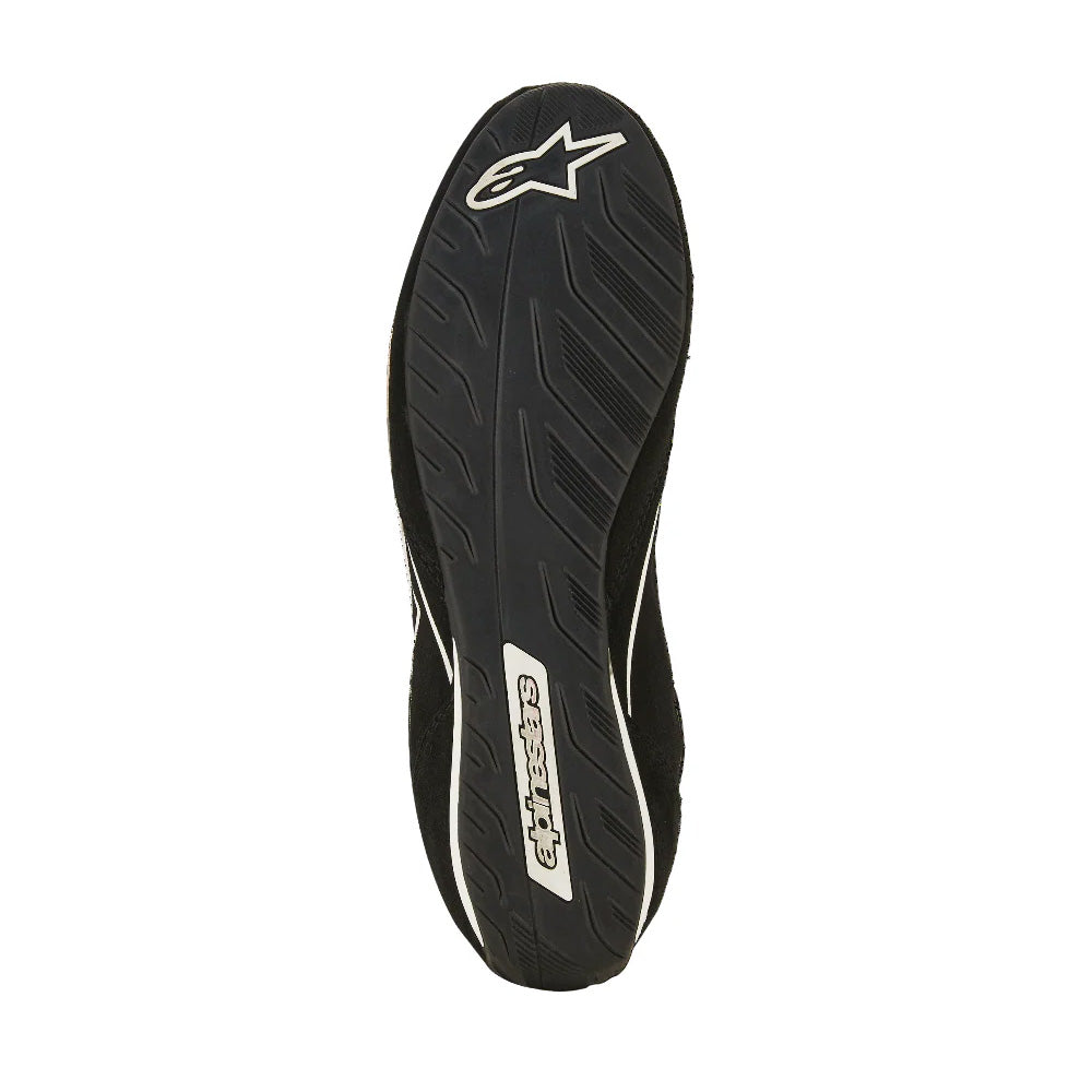 Den ultra tunna och lätta gummisulan är speciellt utvecklad av Alpinestars för maximal pedal känsla och grepp, vilket möjliggör precisa gas- och broms ingrepp. Förstärkt hälkappa i komprimerat läder förbättrar stabilitet och skydd, medan den låga bakre ankelkragen och elastisk flexzon ger ökad rörlighet och smidigare fotarbete.
